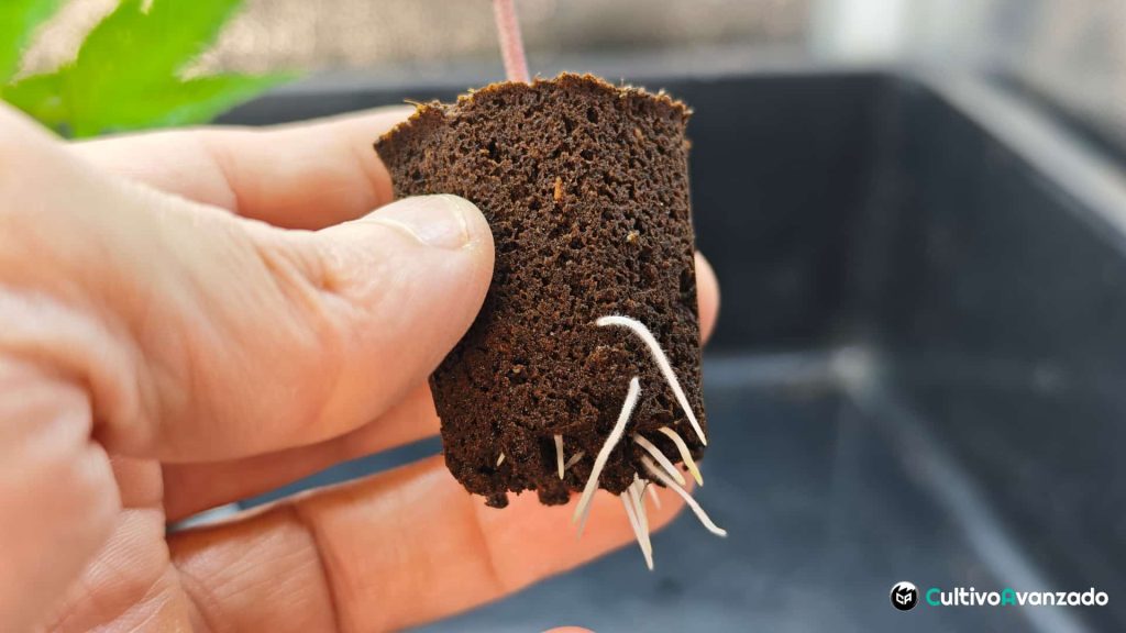 Algunos esquejes asomaran alguna raíz esto te mantendrá en alerta para comprobar el estado de cada uno de ellos y de paso hidratar si hace falta los esquejes que lo necesiten, posiblemente el sustrato de algunos de ellos se haya secado demasiado, simplemente sumerge y saca el jiffy rápidamente es darles un toque con la solución no remojarlos. En el caso de no poder realizar esta operación por utilizar otros medios tendrás que humedecer el sustrato un poco por la parte de arriba.